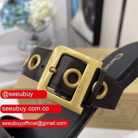 Flat bottom/thick heel flip-flop open-toed slippers, this D family sandal shows a refined and classic silhouette. The design is simple and neat, with adjustable straps on the instep, vintage gold D buckle and decorative eyelets. It is a basic and versatile summer item.
